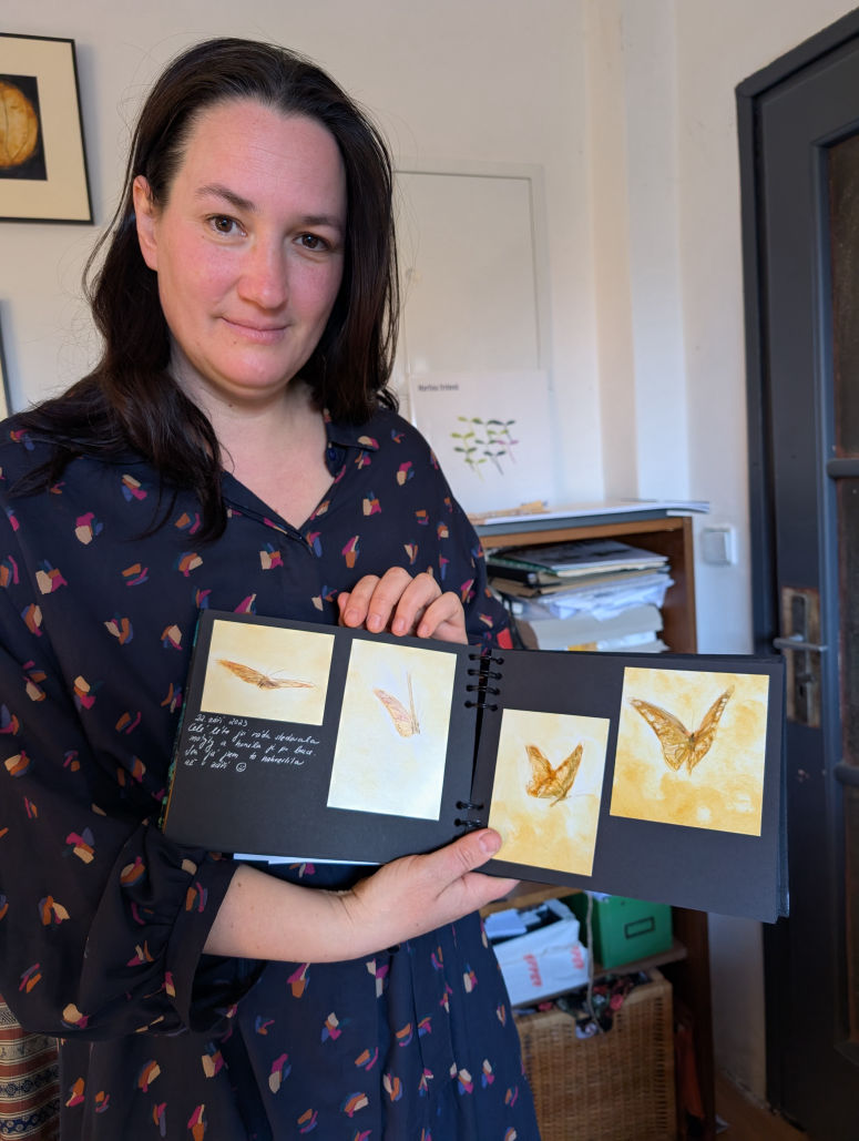 K technice jsem se dopracovala tak, že jsem kreslila své dceři deníčky, a mapovala, co děláme. Ráda jsem experimentovala a těsně před tím, než začal lockdown, jsem tuto techniku objevila. Zkoušela jsem rýt do papíru a zatírat to barvami. Tak mě to nadchlo, že když jsem najednou viděla nějakých těch deset dvacet obrázků, říkala jsem si, že by z nich bylo krásné vyprávění v knize. Vlastně mě ani nenapadlo, že by k tomu byl potřeba text. Byla to taková náhoda. Pak jsem se sama učila vyprávět bez textu. Tehdy jsem propadla silent books, třeba od Shauna Tana nebo Sydneyho Smitha, a nesmírně mě zajímalo, jak se dělají příběhy beze slov. Zabývala jsem se tím tři roky, vyhodila jsem spoustu obrázků, hledala cestu. Moc mě to bavilo, protože tato technika má zvláštní dynamiku. Člověk musí používat detaily i vhledy do celku, aby všechno řekl.