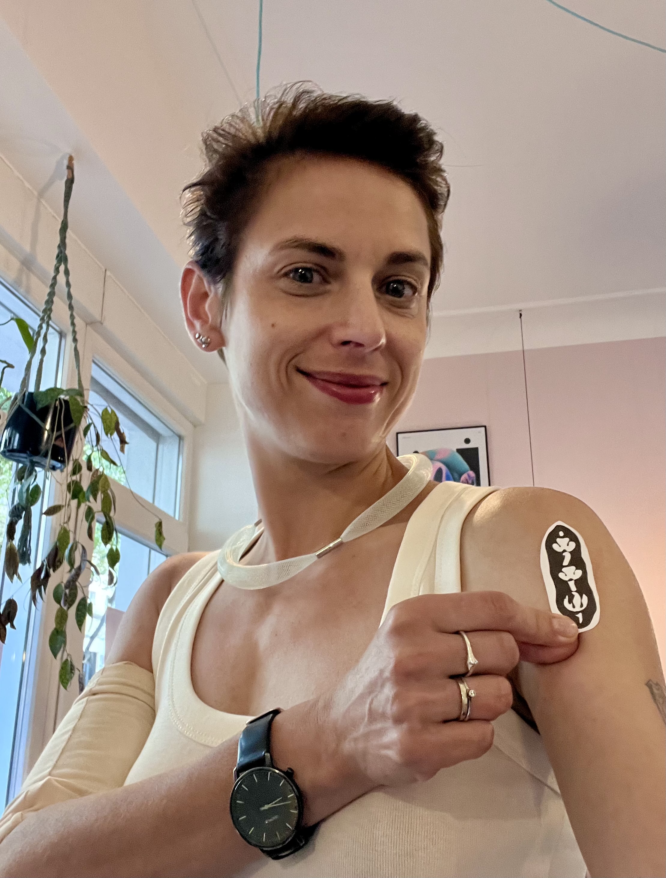 Měl pravdu, za necelou čtvrthodinu je hotovo. Jsem spokojená: je to přesně to místo a přesně ten obrázek. Tři podivné tvary, podmořská zvířata, lidská pohlaví nebo tropické rostliny. Do mé pražské paže se v Berlíně otiskl fragment mého rodného Kyjeva.