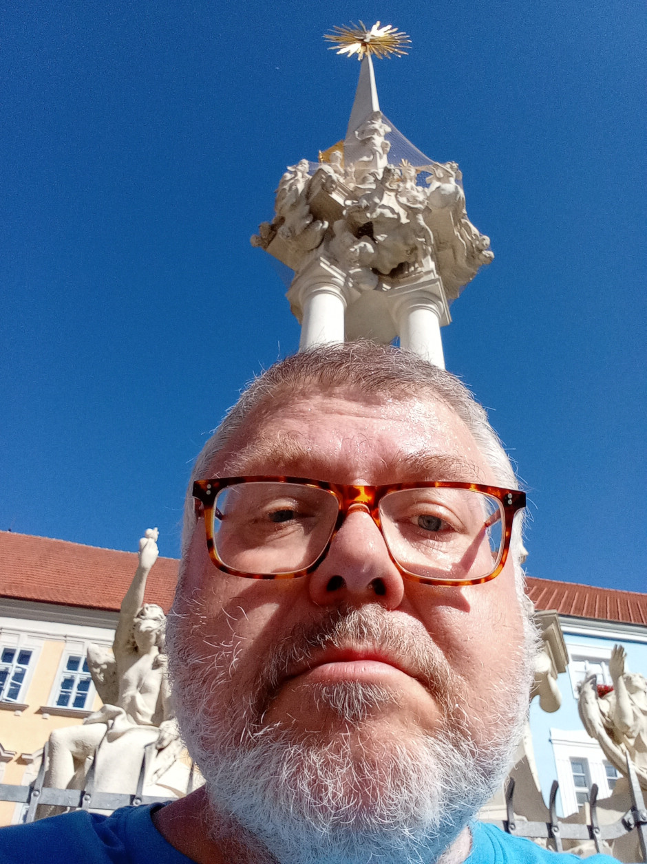Vyrážím na výšlap po schodech na vyhlídkový ochoz kostelní věže. Cestou míjím zvony a vystavené obrazy místních umělců. Nikde ani noha. Shora je nádherný pohled po kraji i po městě, ač bystré oko pozorovatele narazí i na několik kazů: třeba klasicistní budova pošty je shora a zezadu zhanobená brutálně brutalistní přístavbou. Přitom z uliční úrovně si toho člověk nepovšimne.